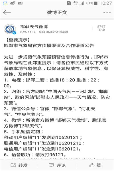 为进一步规范气象预报信息传播,便于公众获得及时、准确、权威的气象预报信息,邯郸市气象局于近日开展了官方气象信息传播渠道公告。邯郸局通过“邯郸天气”官方微信、新浪“邯郸天气微博”等官方网站进行公告。公告内容包括电视、网络、手机、固话等获取官方气象信息的方式方法,郑重提示公众通过官方渠道获取及科学、权威、有效及时的天气信息。