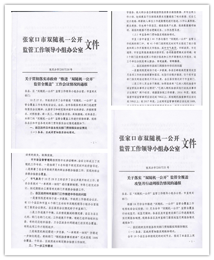 今年以来,市气象局按照市政府统一安排,深入开展“双随机一公开”工作,建立了“一单两库一细则”,15项抽查事项全部被市政府列入“张家口市本级双随机一公开抽查事项清单(市场监管执法类)”;率先加入全市“双随机一公开”成员单位政务外网系统,并启用了“河北省双随机多部门联合抽查软件”;在积极做好易燃易爆场所等监管领域“双随机一公开”执法检查的同时,本周将联合市安监局、公安局开展跨部门联合检查。
